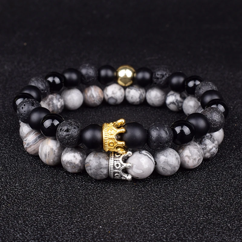 Buen artículo y envío breve. vendedor recomendado para Pulsera con cuentas de piedra Natural para hombre y mujer, brazalete con abalorios de corona de Lava y obsidiana, joyería de amistad a distancia