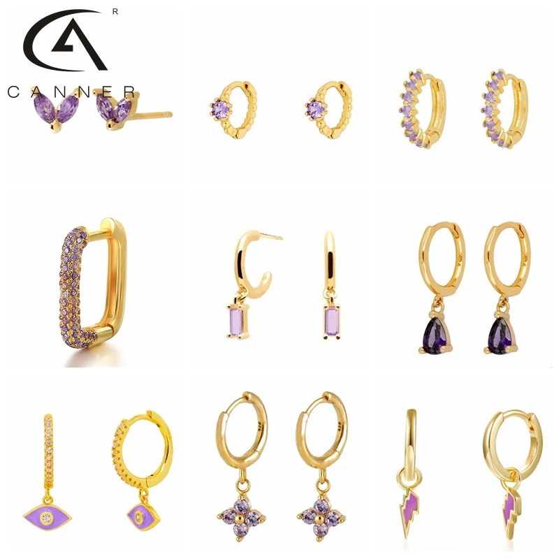 Apropiado artículo y envío rápido. vendedor recomendado para CANNER-pendientes de Aro para la oreja de Plata de Ley 925, joyería elegante de circonia cúbica púrpura, con flores de cristal, para mujeres